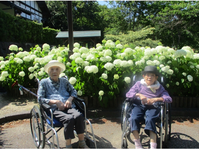 6月12日(水)木曽三川公園にでかけました。公園内にある、輪中の農家・水屋周辺に咲いている、あじさいをみにいきました。今年の梅雨は平年より遅れているため天気にもめぐまれ🌞太陽の光をあび、色鮮やかに咲くあじさいに「きれいだね~」と。木陰に入ると涼しく、きもちのいい苑外外出となりました。
