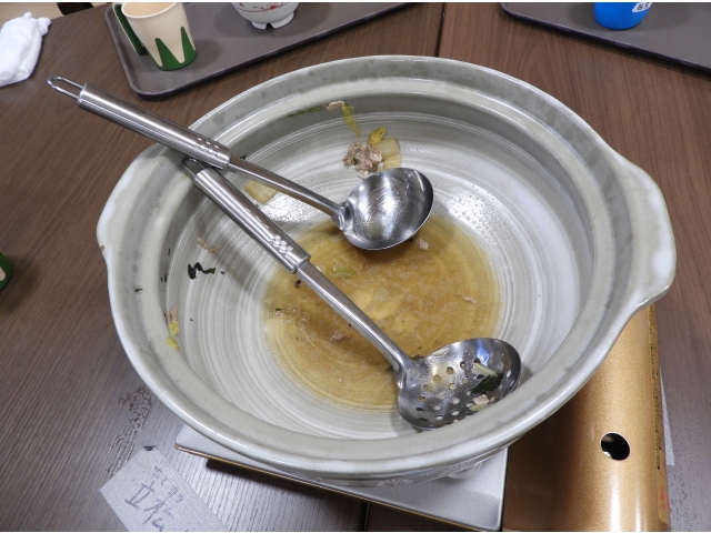 2度目の鍋料理は「豚ちゃんこ」鍋でした🍲 一つの鍋がなかなか湯気が出ず「火が弱いよ」とご指摘が💦「これだけガスが少なかったからね」と。いいにおいが町全体にただよってきたので待ちきれないですよね~。 今回もおかわりたくさんしていただき、お鍋の中はピッカピカ✨
