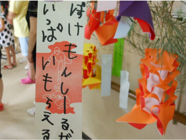 七夕の歌を元気に歌ってくれたあと、子どもたちの願いが飾られた七夕飾りのプレゼント。
