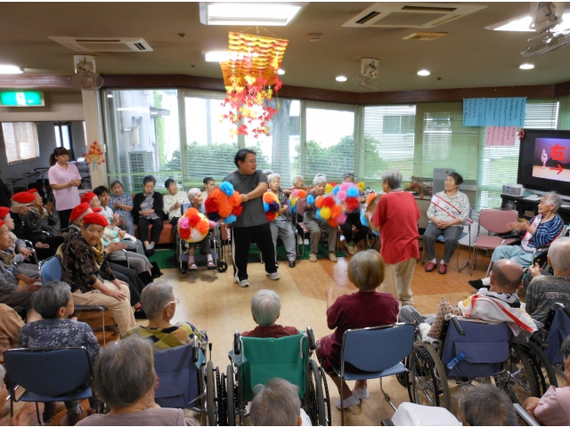 米寿、長寿の方の紹介・お祝いの後、各フロアのスタッフと利用者の皆さんが一緒になって出し物を披露していただきました。