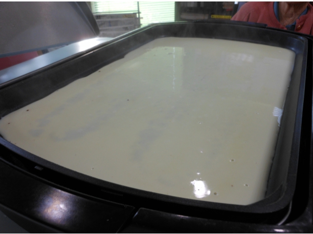 皆さんの前で湯葉を「釣り上げる」ことができるように、ホットプレートに豆乳を入れて作りました。