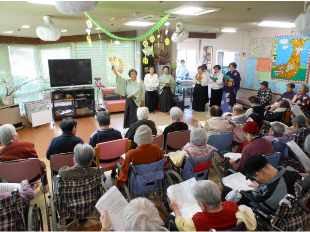 まずは簡単な発声方法を教えていただき、武田節、富士山、長生きの詩など、皆さんご存知の唄を詩吟アレンジで一緒に楽しみました。