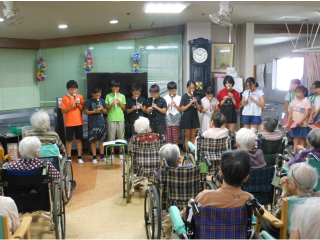 6月25日・26日・28日の3日間、陶原小学校6年生の白組・赤組・青組の皆様が日替わりで慰問に来て下さり、歌や劇などの披露と利用者様に折り紙で作ったプレゼントをしていただきました。