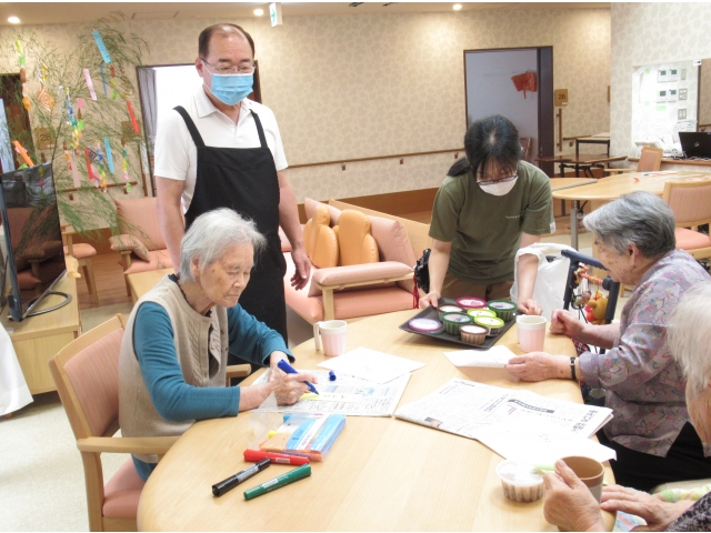 瀬戸苑の七夕会は 短冊に願い事を書きました。 平凡に毎日を過ごすのが一番だね と仲良し3人組 健康に過ごせますように 願いました。