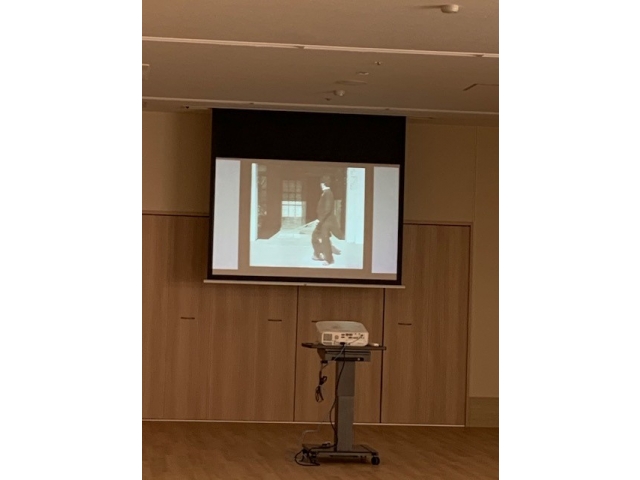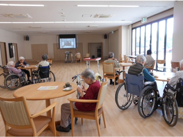 改築で新しくできたこのひろーい地域交流スペースを使用しているのでソーシャルディスタンスもとれ安心です。ご入居者様はおやつを召し上がりながらチャップリンの短編映画をご覧になりました。
