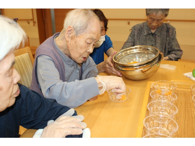 入居者様にみかんを取り分けて頂きます。
