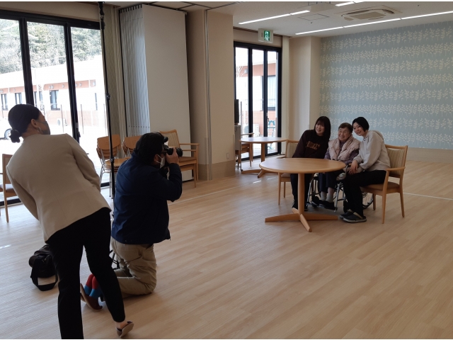 求人用パンフレット作成のため取材を受けました。モデル役として、採用2年目のお二人、生活相談員の森山さんと介護員の伊井さんに協力をお願いしました。主役は職員ですが、脇役として入居者の方にもモデルとしてお手伝いしていただきました。皆さん、とても素敵な笑顔でしたよ。