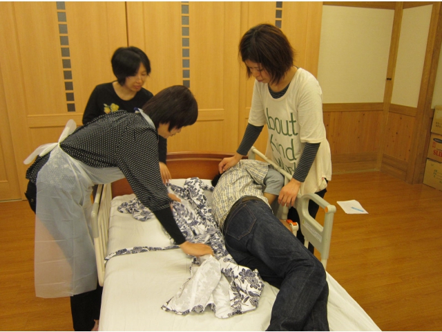 介護職員を対象に、介護主任及び看護職員を講師として、地域交流スペースでおこないました。まず前半に看取り介護についての講義を行い、後半では3グループに分かれて、実際に死後処置の実技を行いました。参加した職員からは、「実際にモデルとなった職員に対し、実技演習を行ったのでわかりやすかった。」との感想が多く寄せられました。同内容の研修を3回に分けて実施する予定です。