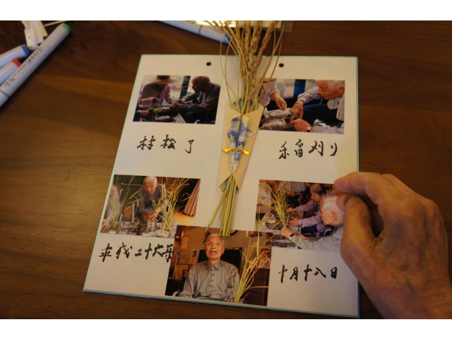 今年の夏、ベランダで育てた稲を色紙に飾りつけました。稲穂を熨斗鮑(のしあわび)風に仕立てたものを、各自に作っていただき、田植えや稲刈りの写真を配した色紙の真ん中に、貼り付けていただきました。コメントもご自分で書ける方には書いていただきました。