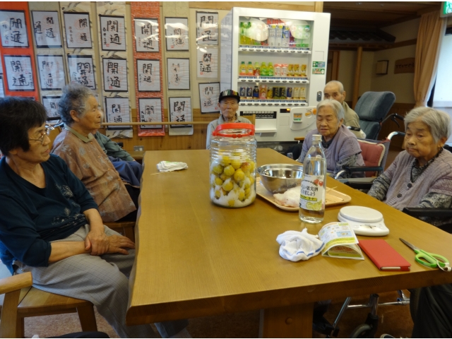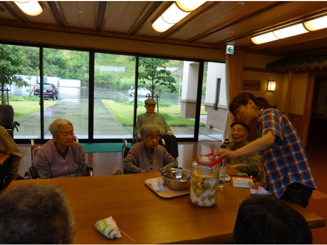6月21日 一階の2ユニット合同で梅干し作りを開始。 梅は、職員自宅の木から摘んできたものです。 串でつついて穴を開けてから容器に漬けるのだそうです。