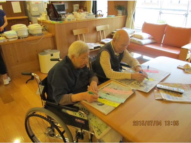 7月4日(土)の午後、リビングにてユニット行事の一環として、七夕会を行ないました。苑内にある笹を用意し、入居者様と職員で楽しく飾り付けを行ない、短冊には各々、願いごとを書きました。