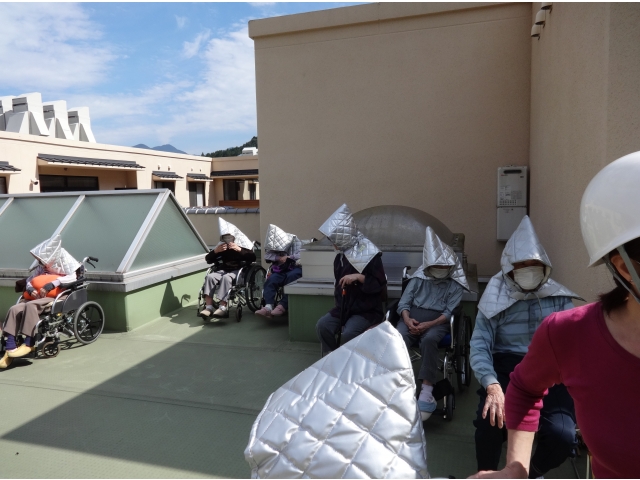午前7時30分に警戒宣言が発令されたとの想定から、職員の通報訓練、その後に地震発生に伴う避難訓練、また厨房からの火災発生による初期消火訓練、消防署への通報訓練等を行いました。