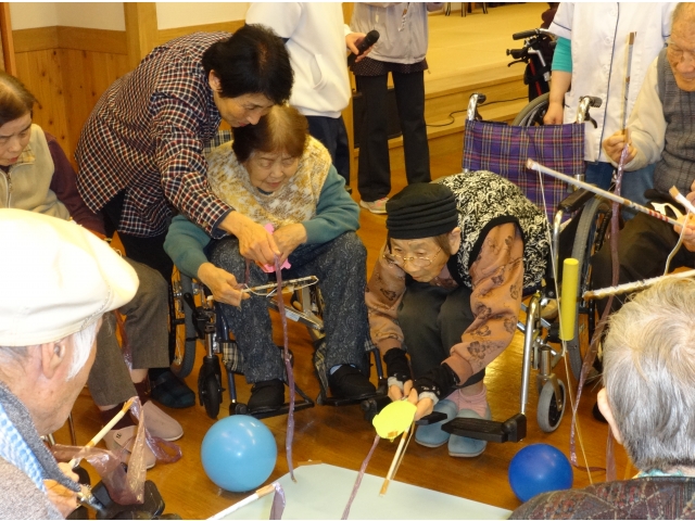 平成27年11月25日(水)午前10時30分から、地域交流スペースにて行いました。 実習中の田原福祉専門学校の3名の生徒さんが、内容を考え、準備をして実施してくれました。 青い色画用紙を池にみたて、その中に魚をいれ、先に磁石のついた釣竿で魚を釣るというレクリエーションです。 3つの池に利用者様が輪になり、魚釣りをしました。 みなさん真剣に魚を釣って楽しんでいました。