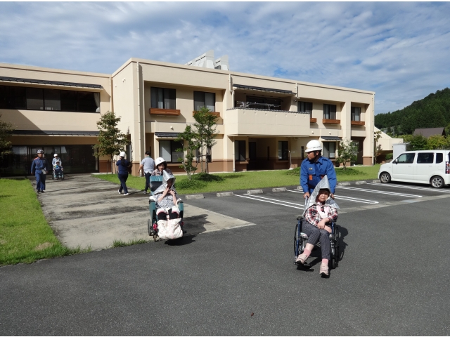 当日は暑い中、新城市消防署設楽分署、設楽町消防団清嶺分団の皆様にご参加いただき、分団の皆様には、利用者の避難誘導介助や負傷者の担架搬送などを職員と一緒に行っていただきました。