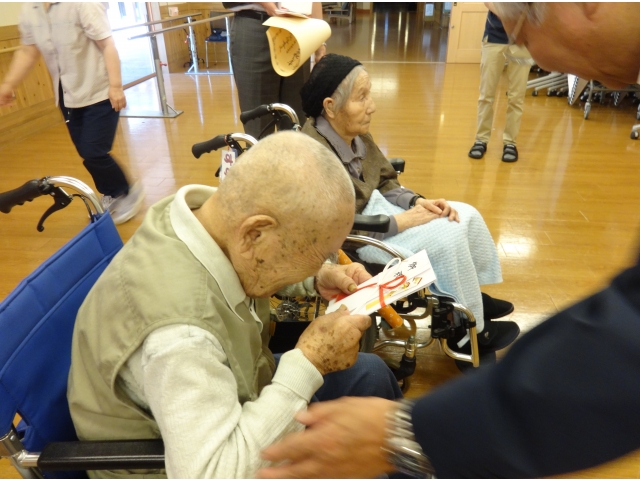 数え100歳以上の入居者様へお祝い金の進呈、数え100歳となる方へ内閣総理大臣からのお祝い状と記念品の授与が行われました。