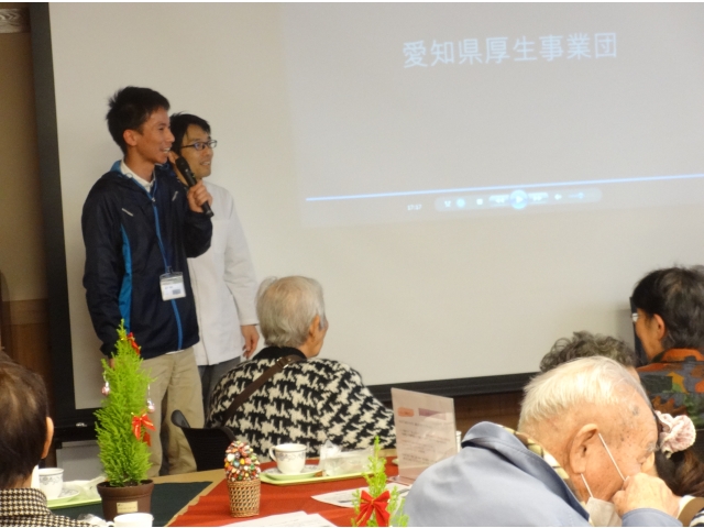 第4回目となった今回は、愛厚ホーム大府苑で作成された「介護予防DVD」を上映し、来店していただいた皆様と当苑の理学療法士が一緒に体を動かしました。