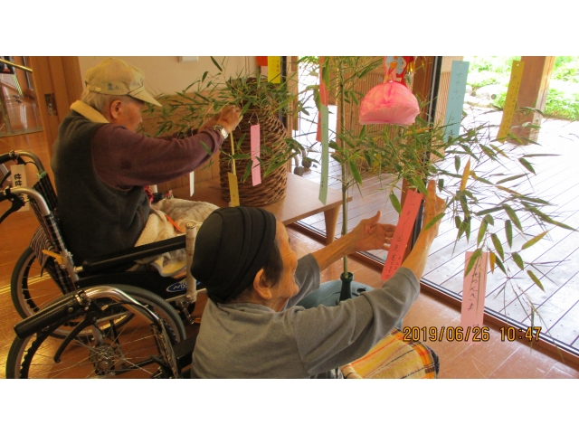 愛厚ホーム設楽苑では、毎年恒例の清嶺保育園の園児さんと七夕会を行いました。今年は4名の園児さんに参加していただきました。入居者の皆様、園児の皆様ともに短冊に願いを込め、真剣な様子で書いていました。
