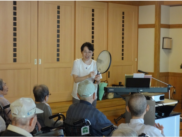「汽笛の音」「オーシャンドラム」「うちわ太鼓」など様々な楽器を用いて、季節を感じつつ、その時の情景を思い出し懐かしんで頂けるよう、入居者の方々の情動に働きかけるようなプログラムとなっていました。
