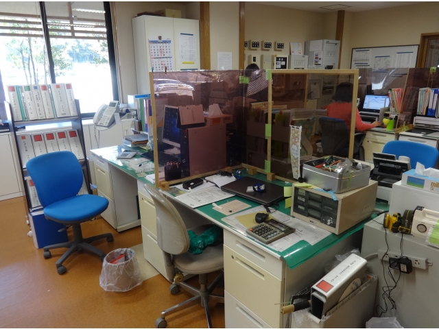 そのような状況の中、事務室では新たに飛沫感染対策として各職員とのデスク間に技術員製作の再利用のアクリル板、窓口へは透明フィルムを設置しました。
