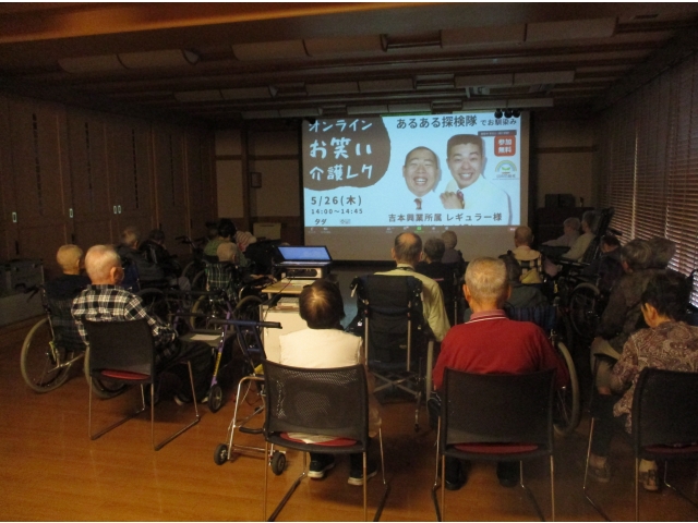依然として続くコロナ禍で、外出や外泊も出来ず退屈な施設生活を送っている入居者さまに、少しでも楽しい時間を過ごしていただこうと 吉本興業レギュラーによるオンラインお笑い介護レク へ参加しました。30名程の入居者さまが参加され、漫才コンビ「レギュラー」の楽しいトークと簡単なミニゲームで体を動かし、いつもとちょっと違う、楽しい午後のひと時を過ごしました。
