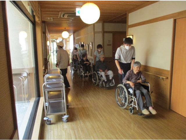 今回は1階ユニットの入居者さまを対象とした避難誘導訓練を行いました。限られた職員でいかに多くの方の避難を安全に迅速に行えるか、繰り返しの訓練が重要となります。