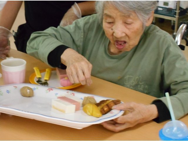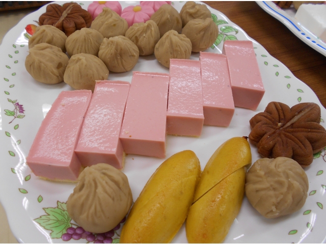 ケーキ2種類、スイートポテト、もみじ饅頭、練り切り、栗きんとん、水ようかん の中から選んで召し上がっていただきました。