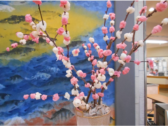 紅白のお餅を上手に枝へ付けています。 とても上手に仕上がりました。