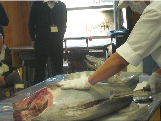 今年もマグロの解体を行いました。利用者のみなさんも待ちに待ったマグロの解体。始まる時間に合わせて、利用者さんも準備万端。切ったばかりのマグロを試食し、“おいしい。やわらかい。”などの声が上がりました。