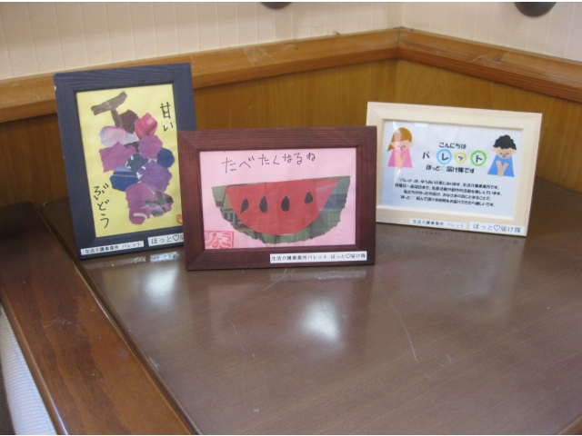 ゆうあいの里にある生活介護事業所パレットを利用されている障害者の皆さんの活動を応援するため、豊川苑では6月から、玄関ロビーの一角を展示スペースとして提供することとなりました。