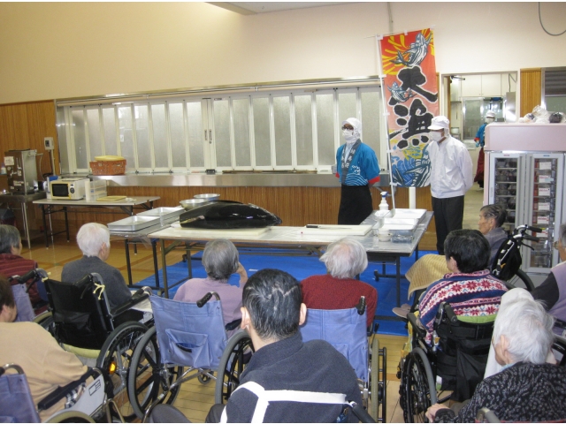 食事は利用者様にとって楽しみのひとつ。季節によって旬の食材を楽しむことも、豊川苑では出来ます!今日は調理師さんのご協力によりまぐろの解体ショーを行いました。本日のまぐろは40kgのキハダマグロ。約200人分の刺身が取れるとか。「私よりも重たいじゃん。」「こんな大きなの見た事ないわ。」と皆さま大興奮!