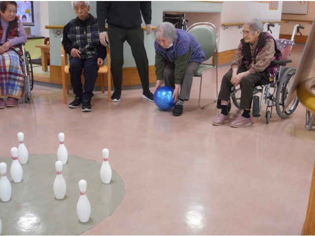 豊川苑では余暇時間にボーリングやゴルフなど軽く体を動かすことが出来るレクを行っておりますが、今回は、オリンピックみたいにボーリング大会を開催しました。
