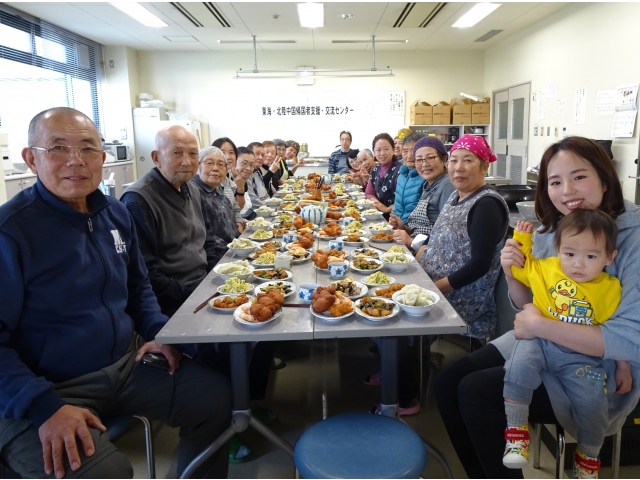 完成後、一つのテーブルを全員で囲んで試食しました。調理中は隣室で談話や「二人転」(中国のコント)映像鑑賞などを楽しんでいた1世からも、美味しさと見事な出来栄えに感嘆の声が聞かれました。